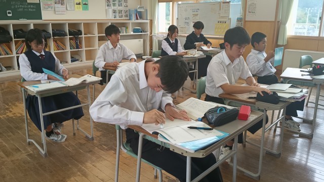 2年生は国語、「モアイは語る」の中から事実と根拠に基づいた意見を読み分けることを学んでいました。