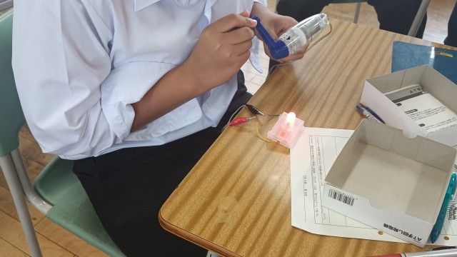 3年生は理科、エネルギーの変換で電気を起こしてランプ点灯などの実験をしてました。