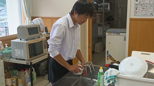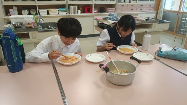 1年生は家庭科、青菜と卵の炒め物、野菜スープを試食してました。