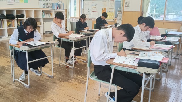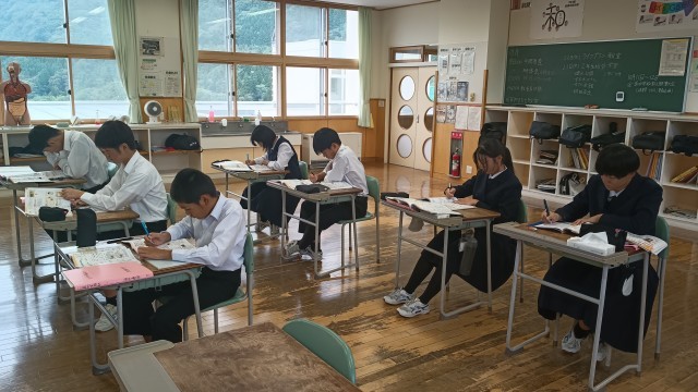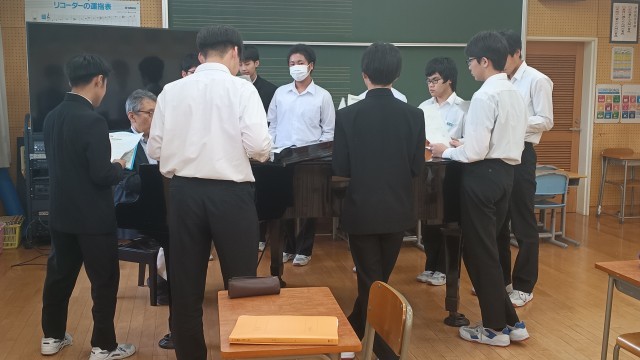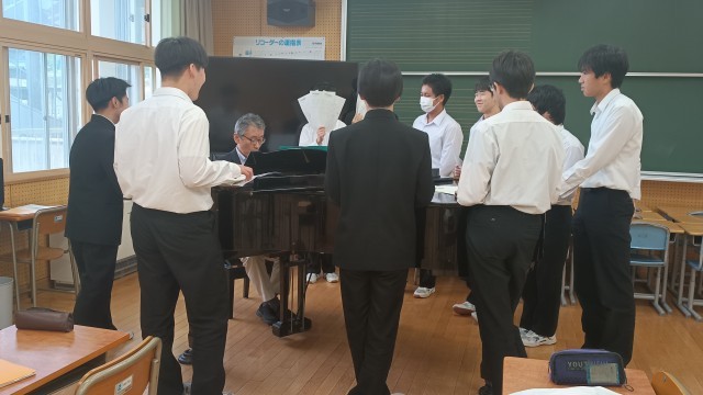 3年生は音楽、ピアノを囲み合唱練習をしてました。