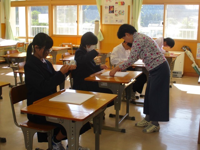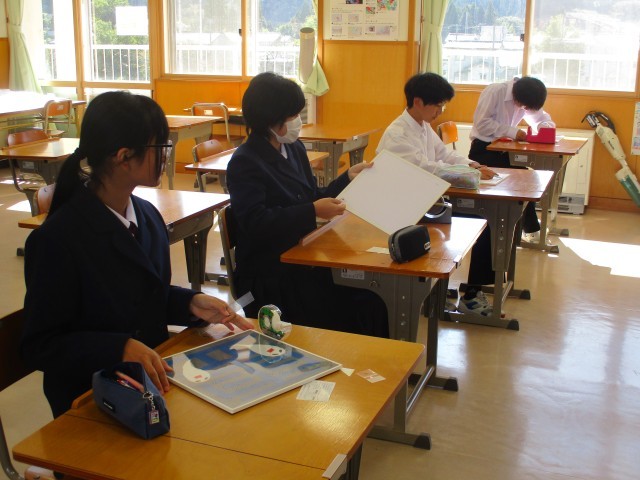 1年生は美術、自分たちのアート作品の枠を作っていました。
