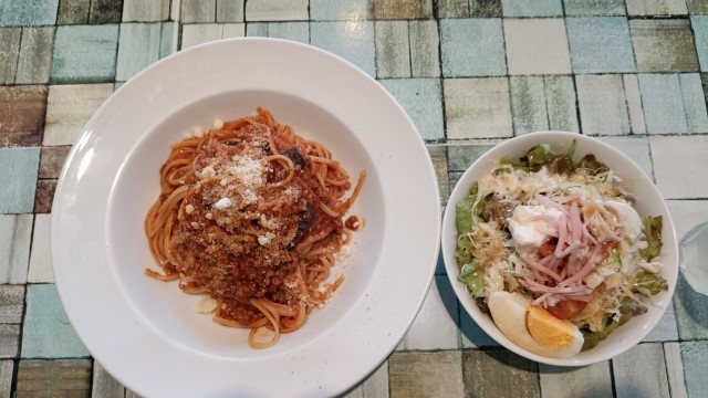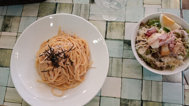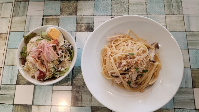 今日の2学年の献立はサラダ、明太クリームパスタ、若鶏のペペロンチーノ、ナスのボロネーゼ、オレンジジュースです!