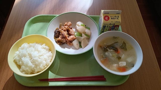 鶏肉とレバーの香味ソース、かぶの色どり、みそ汁
