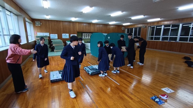 本校は災害時の一時避難所に指定されています。そこで、避難所として開設されたときに必要な物資がどこにあるのか神通碧小学校児童5・6年生と一緒に確認しました。実際に避難所で使用する荷物を運んだり着替えや傷病者用パーテーションの広さを確認したりしました。また、2メートル四方の避難所での待機スペースを体験してみました。「家族全員このスペースに入れるのかな」「寝るときはすごく狭いな」といった声が聞こえました。