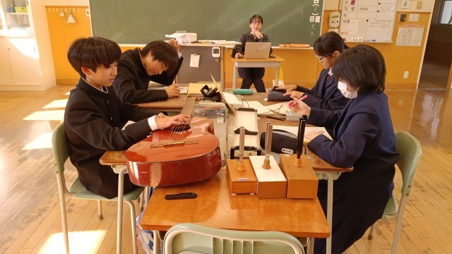 1年生は理科、ギターなどを使い音の大きさや高さについて実験中でした。