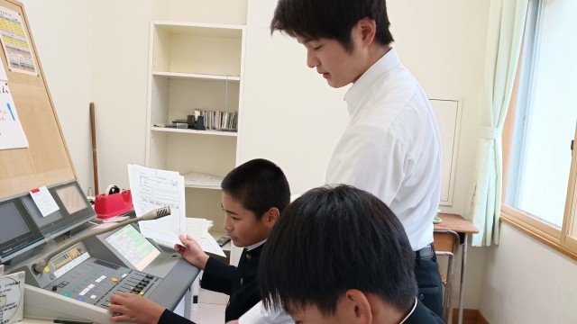 後期から生徒会改革に伴い放送当番は学級の係に移行しました。全員が放送当番をしています。そこで、放送経験者が機器の使い方を教えています。お互いにわからないことは聞き合う、そういう雰囲気で仕事を進めていきます。
