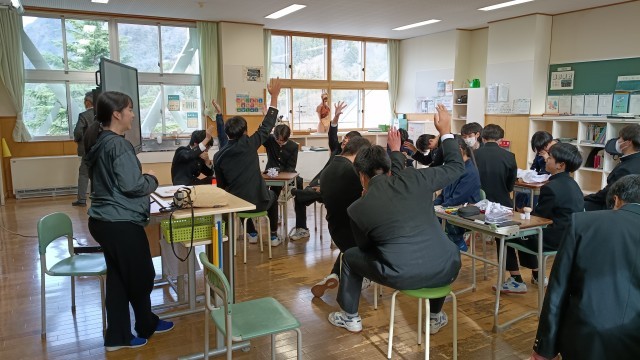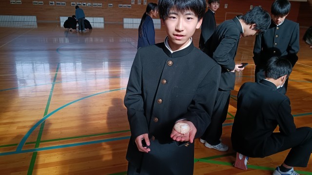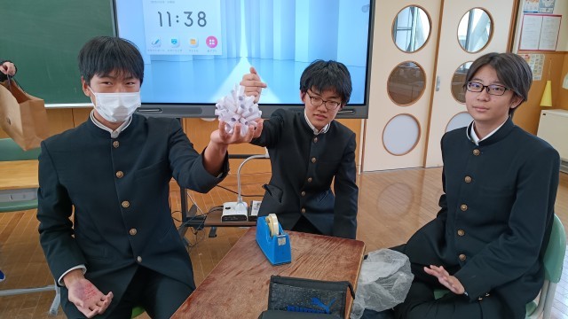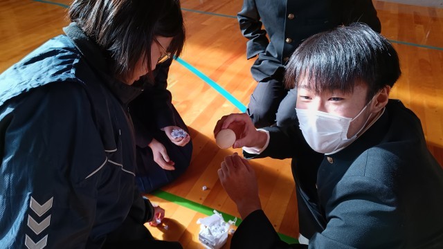 本日2日目、合同理科 「高い所から落ちる卵を守ろう」それぞれのグループが制作したものを