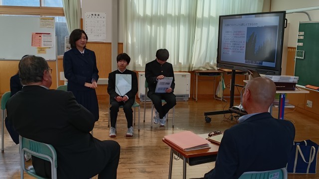 5・6限の楡の木タイム(総合的な学習の時間)に神通峡在住の2名の講師をお迎えして、ESD講座を実施いたしました。課題「住み続けられるまちづくり」について追究している1年生が、地域の方に向け、今年度得た学びのまとめや今後の取組に関する提案を行いました。講師の方の講話や、提案に対する助言をいただき、大変実りのある講座となりました。