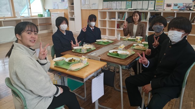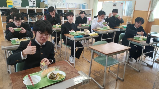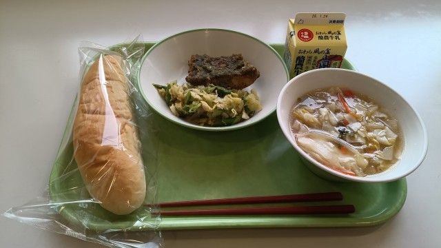 コッペパン,ホキの磯辺揚げ、アスパラガスのごまだれ、ワンタンスープ