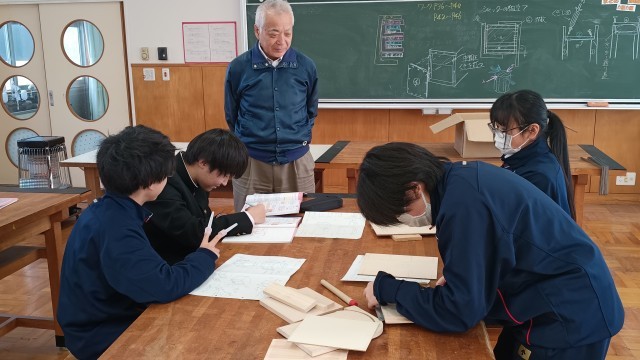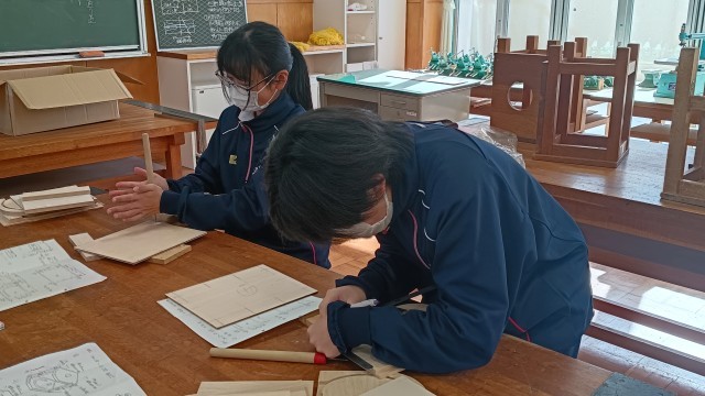 1年生は技術、シャッターボックス製作の下作業できりで穴あけ加工をしてました。