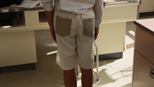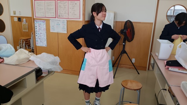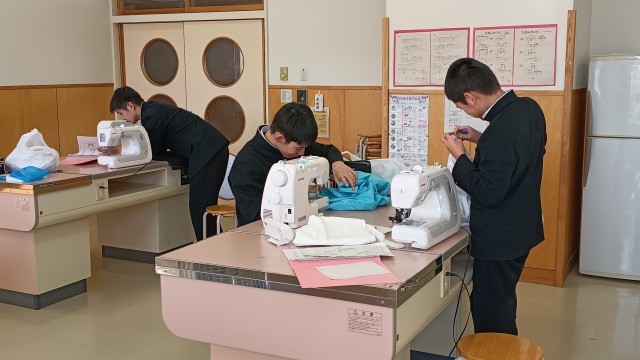 2年生は家庭、ハーフパンツ作り完成したパンツを試着したり、身体に当てたりしてます。
