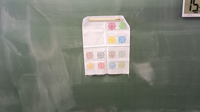 1年生は美術でトートバックにハンコで押す模様を考えて彫っていました。