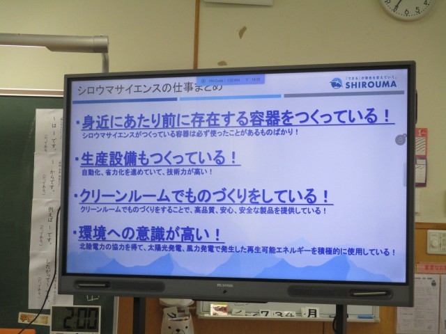 立山科学(株)とシロウマサイエンス(株)の担当者をお招きして講演を開催しました。会社の概要から特徴についての説明の後、働くことの意義や楽しさについて学びました。