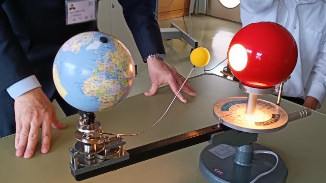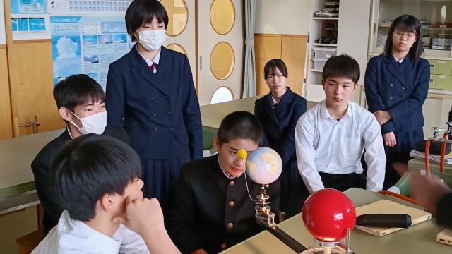 2年生は理科、実験装置を使い「皆既月食」「皆既日食」を体験してました。