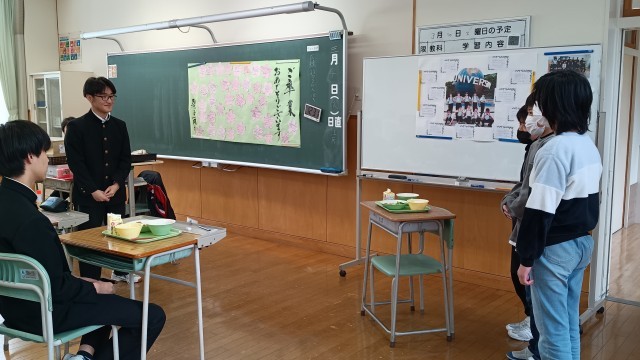 本日の給食時間帯に神通碧小学校5年生代表3名が本校3年生教室を訪れ、これまでの関わりとして合同運動会や学習発表会での感謝を伝え、「これからも頑張ってください。」と神通碧小学校児童一同からのメッセージを受け取りました。
