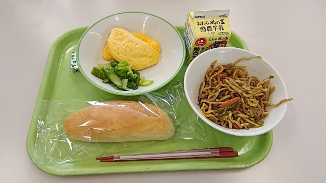 グリーンサラダ、オムレツ、焼きそば、ポケットチーズ、コッペパン