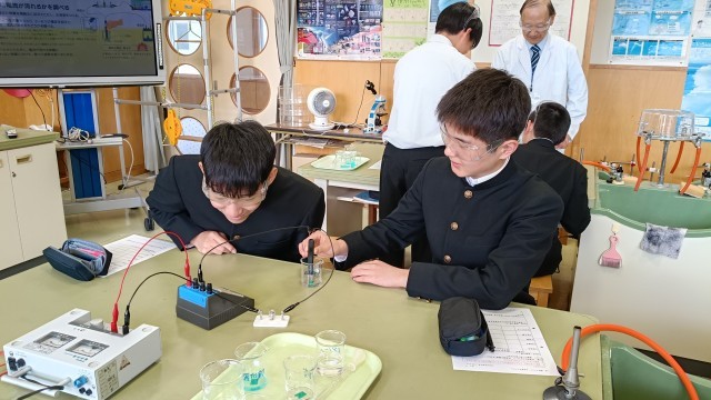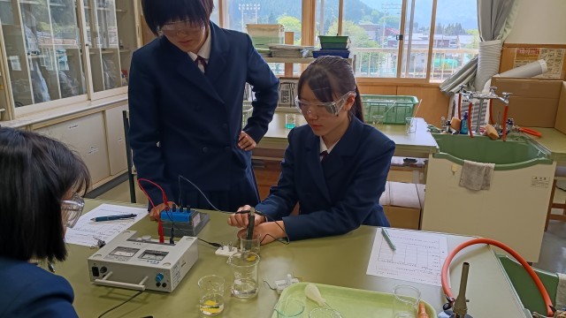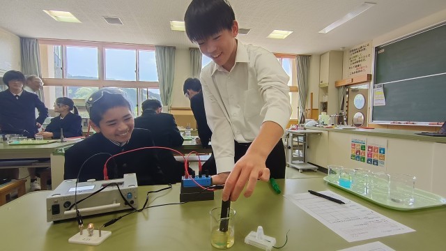 3年生は理科、「水溶液に電流が流れるか」を調べる実験で精製水、塩水、塩酸などを使い電流を流して