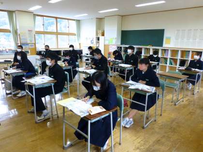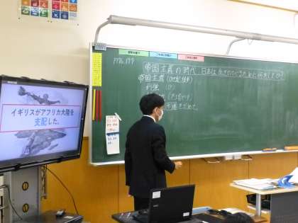 3年生の授業が本格的に始まりました。 公開日 2021/04/09 更新日 2021/04/09 日々の活動から 4月9日(金) 1限は社会で歴史でした。 学習課題は「帝国主義の時代、日本は生き延びるために何をしたか」でした。 生徒は、教科書を見ながら先生の質問に積極的に答えたり、ノートをていねいに書いたりしていました。