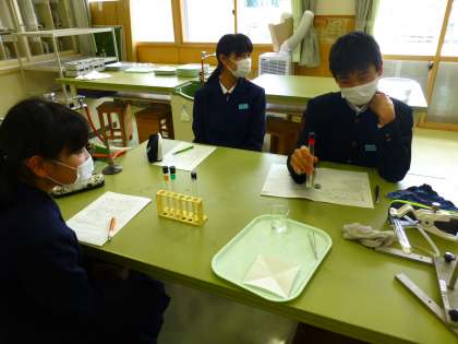4月16日(金) 2年生の理科の授業の様子です。 固体を熱して発生した気体は何かを調べる実験をしました。