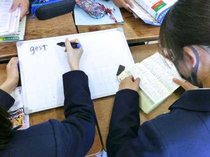 その後「客」という日本語を表す英単語をグループで見付ける活動を行いました。