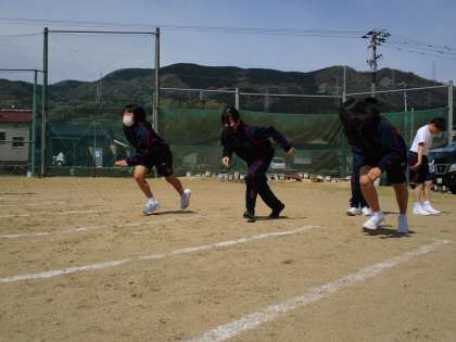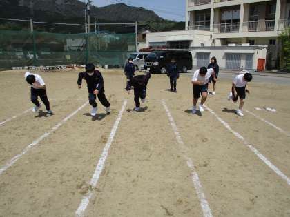 1年2限 保健体育 公開日 2021/04/22 更新日 2021/04/22 日々の活動から 4月22日(木) 1年生の体育の授業の様子です。 今日は50m走の測定を行いました。 小学生の頃よりタイムが伸びた生徒はとてもよろこんでいました。 小学生の時はステンディングスタートでしたが、中学生はクラウチングスタートで行いました。