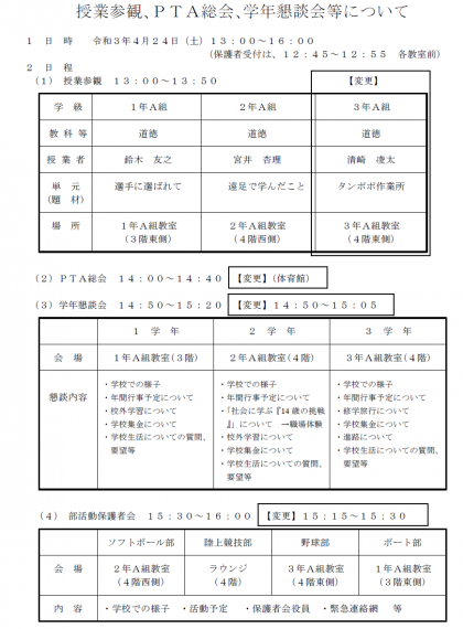 4/24(土) PTA総会会場変更及び学年懇談会・部活動保護者会時間変更 公開日 2021/04/23 更新日 2021/04/23 学校からのお知らせ 4月23日(金) 明日の「PTA総会 会場」及び「学年懇談会・部活動保護者会 時間」は、新型コロナウイルス感染拡大防止対策として次のように変更しますのでご確認ください。 この文書は、明日受付時に配付する予定です。