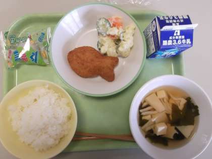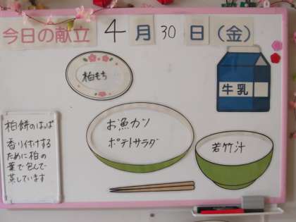 今日の給食 公開日 2021/04/30 更新日 2021/04/30 日々の活動から 4月30日(金) 4月最後の給食は「こどもの日献立」でした。 ○ごはん ○お魚カツ ○ポテトサラダ ○若竹汁 ○柏もち ○牛乳