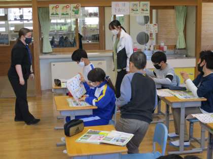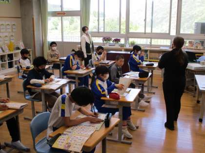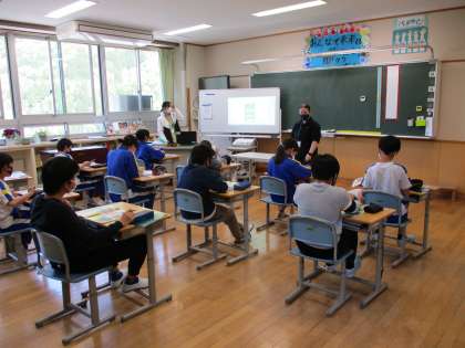 本校の宮井教諭とALTのエミリー先生が、小学6年生の授業を行いました。