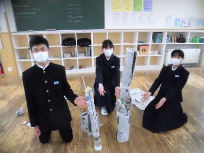 2年6限 「総合的な学習の時間(楡の木タイム)」 公開日 2021/05/08 更新日 2021/05/08 日々の活動から 5月7日(金) 2年生の「総合的な学習の時間(楡の木タイム)」では、社会人基礎力(実行力)について学習しました。 新聞でどれぐらいの高さのタワーを作れるか目標を決めて、協力してタワーを作りました。