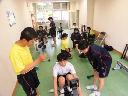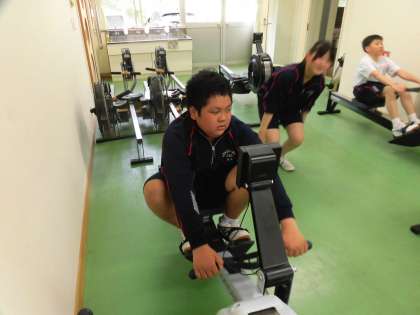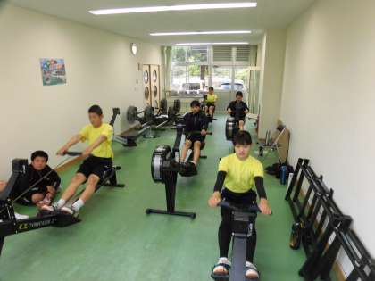 体育館で基礎トレーニングをした後、トレーニングルームでローイングマシーンを使って練習をしました。