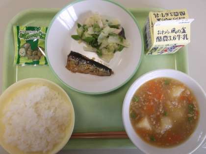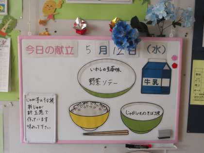 今日の給食 公開日 2021/05/12 更新日 2021/05/12 日々の活動から 5月12日(水) 今日の献立は、次のとおりです。 ○ごはん ○いわしの生姜味 ○野菜ソテー ○じゃがいものそぼろ煮 ○抹茶大豆 ○牛乳 でした。 そぼろにの中にハート型「にんじん」がたくさん入っていました。 ハート型「にんじん」を見付けるだけでも楽しい給食になります。