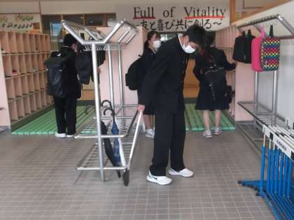 今朝は、3年生の環境実践部長が生徒玄関の清掃を行ってくれました。