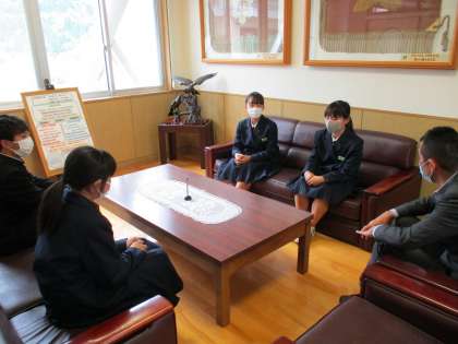 生徒会執行部 公開日 2021/05/13 更新日 2021/05/13 日々の活動から 5月13日(木) 本日の生徒会活動の時間に前期執行部として校長室へ挨拶に行きました。 メンバー一人一人が後期の活動を振り返り、前期生徒会で頑張りたことをしっかりと鍋田校長に伝えました。 鍋田校長からは「先を見通して部活動と生徒会活動を両立できるようにして欲しい」という話がありました。 現在抱いている抱負と鍋田校長の激励の言葉を胸に、前期も活力のある学校を目指して頑張ります。
