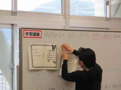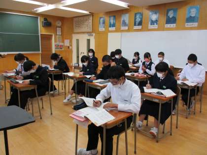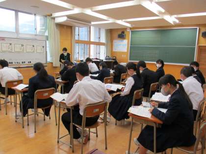 3年1限 音楽 公開日 2021/05/17 更新日 2021/05/17 日々の活動から 5月17日(月) 3年生の音楽の授業の様子です。 「歌詞が表す情景を想像し、声部の役割を理解して表現を工夫しよう」という授業でした。