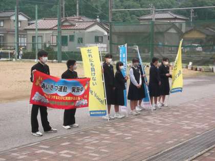 挨拶運動 公開日 2021/05/20 更新日 2021/05/20 日々の活動から 5月20日(木) 今朝は「楡の日」で、生徒会執行部が募集したチームで挨拶運動を行いました。 今日のチームは「集まれ!!楡中の春好き!」でした。 メンバーは、胸にバッジを付けて挨拶をしています。