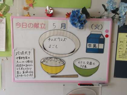 メニューボードには、調理員さんから給食メニューの紹介が書いてあります。