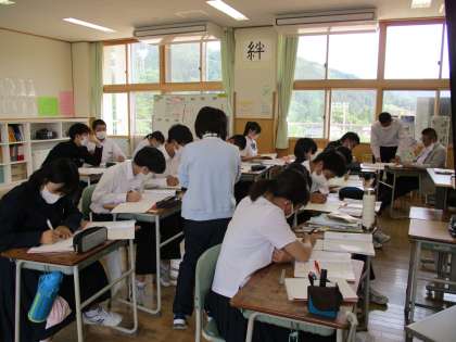 5月26日(水) 数学の授業の様子です。 ルートの計算問題に取り組んでいます。 学び合う姿が多数ありました。