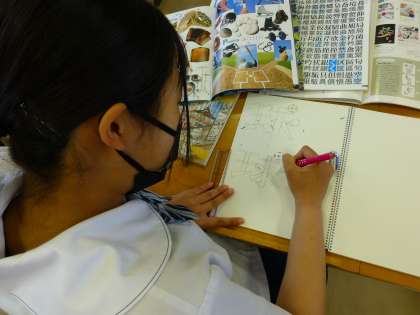 1年2限 美術 公開日 2021/06/01 更新日 2021/06/01 日々の活動から 6月1日(火) 「漢字の意味を楽しく伝えるデザインを考えよう」が学習課題でした。 鳥の絵を描いている生徒が、その絵からどう漢字にしていくのか楽しみです。