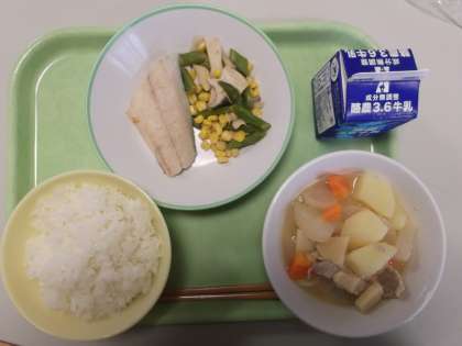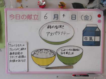 今日の給食 公開日 2021/06/04 更新日 2021/06/04 日々の活動から 6月4日(金) 今日の献立は、次のとおりです。 ○鰆の塩焼き ○アスパラソテー ○じゃがいもと豚肉のみそ煮込み ○牛乳 メニューボードには、調理員さんから以下の紹介がありました。 「アスパラガスのアスパラギン酸は、疲労回復やスタミナ増強に効果があります」