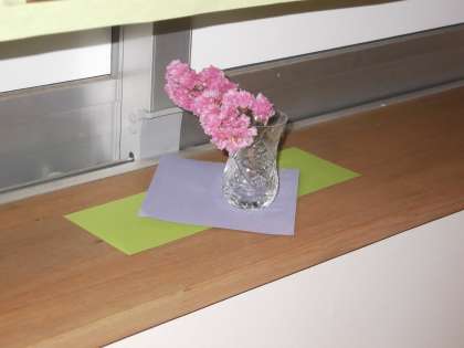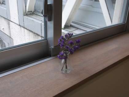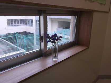 階段の踊り場には、様々な花器に入った花が飾られています。