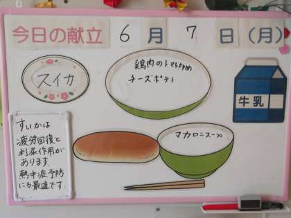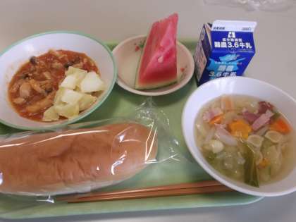 今日の給食 公開日 2021/06/07 更新日 2021/06/07 日々の活動から 6月7日(月) 今日の献立は、次のとおりです。 ○コッペパン ○鶏肉のトマト炒め ○チーズポテト ○マカロニスープ(花形にんじん入り) ○すいか ○牛乳 メニューボードには、調理員さんから以下の紹介がありました。 「すいかは、疲労回復と利尿作用があります。熱中症予防にも最適です。」