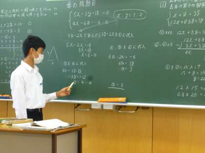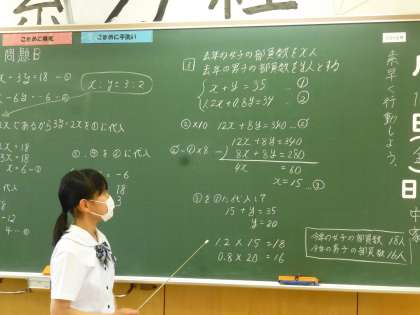 2年1限 数学 公開日 2021/06/11 更新日 2021/06/11 日々の活動から 6月11日(金) 2年生の数学の授業の授業の様子です。 連立方程式の応用問題の説明を全員ができるようになってきました。