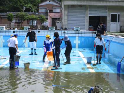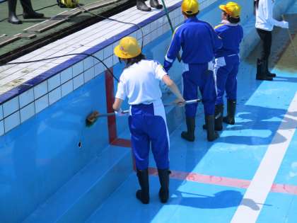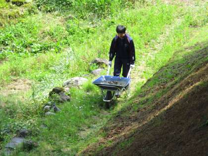 汚い水を一輪車で運びました。 プールの横の壁も磨きました。