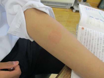 2年生の保健の授業は、前回学習した「飲酒と健康」を元に、養護教諭によるアルコールパッチテストを行いました。