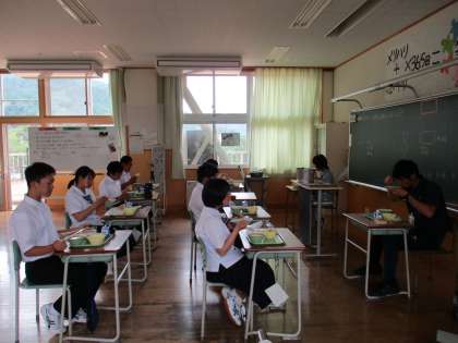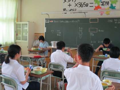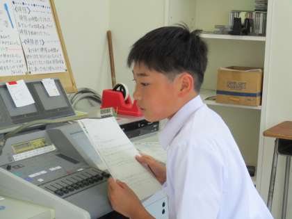 6月14日(月) 1年生の給食の時間の様子です。 放送室で実践部の活動をしている生徒もいます。