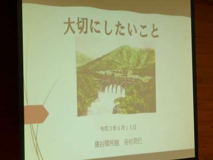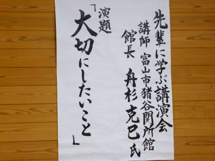 先輩に学ぶ講演会 公開日 2021/06/15 更新日 2021/06/15 日々の活動から 6月15日(火) 富山市猪谷関所館 館長 舟杉 克巳 氏 に来ていただき 「大切にしたいこと」という演題で講演をしていただきました。