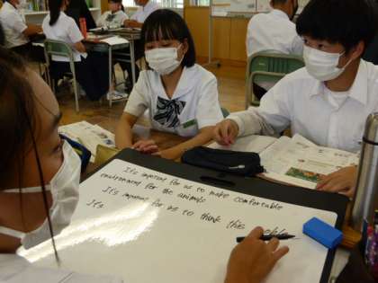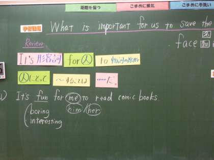 3年6限 英語 公開日 2021/06/22 更新日 2021/06/22 日々の活動から 6月22日(火) 3年生の英語の授業の様子です。 「It's+形容詞+for+人+to+動詞の原形」についてホワイトボードを使って学習しました。