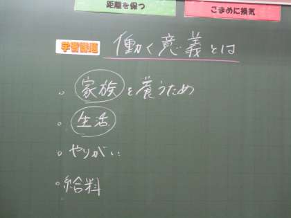 2年6限 「総合的な学習の時間(楡の木タイム)」 公開日 2021/06/25 更新日 2021/06/25 日々の活動から 6月25日(金) 2年生の「総合的な学習の時間(楡の木タイム)」の様子です。 もうすぐ「社会に学ぶ『14歳の挑戦』」が始まります。 そのために「働く意義」について考えました。