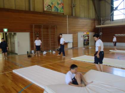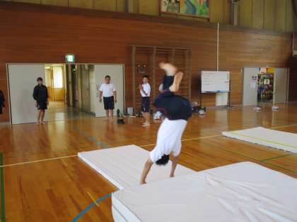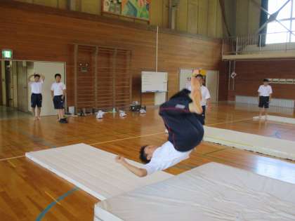 6月28日(月) 1年生の保健体育の授業の様子です。 マット運動で前方倒立回転の練習をしている様子です。