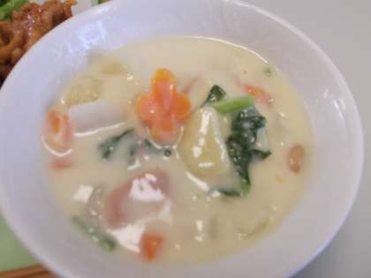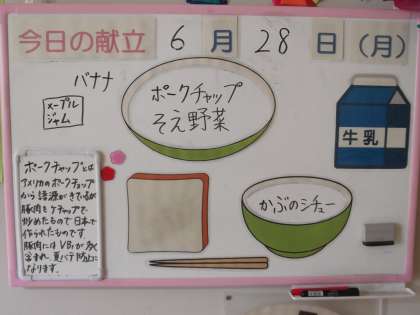 「ポークチャップとは、アメリカのポークチョップから語源がきているが、豚肉をケチャップで炒めたもので、日本で作られたものです。豚肉にはVB1が多く含まれ夏バテ防止になります。」